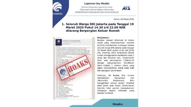 Beredar informasi yang tersebar di layanan pesan instan WhatsApp mengatasnamakan Kementerian Komunikasi dan Informatika (Kemenkominfo). Di dalam pesan itu dituliskan bahwa hari ini mulai pukul 14.30 WIB sampai 22.00 WIB ada sejumlah ruas jalan di Jakarta akan disterilisasi.