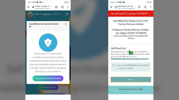 Uniknya, pemprov menyediakan opsi 'Identifikasi Diri Terkait Covid19'. Sayangnya hanya masyarakat yang tinggal di provinsi Sulses yang bisa melakukan pemeriksaan dini.